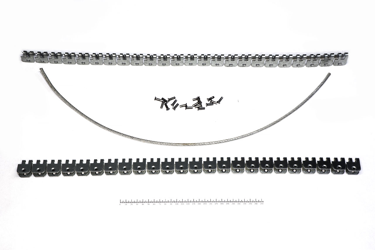Описание: cоединение состоит из двух планок из оцинкованной холодно-катанной стали толщиной 1.2 мм, по 24 штуки звеньев в каждой; троса ПВХ-3055М 4/5 мм в стальной оплётке и заклёпок диаметром 4 мм, длиной 14 мм в потай, в количестве 48 штук. Ширина замка может меняться в меньшую сторону путём удаления лишних звеньев. Соединение "Barger" выдерживает большую нагрузку, по сравнению с соединением "Крокодил".