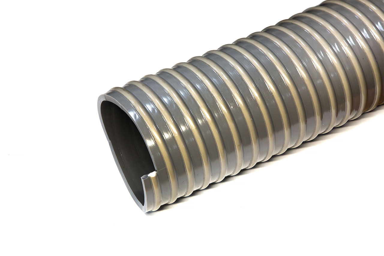 Описание: состоит из цилиндрической оболочки из пластифицированного поливинил хлорида с замоноличенным внутри ее прутком из непластифицированного поливинилхлорида. Внутренняя поверхность шланга гладкая, внешняя - волнистая. Цвет: непрозрачная серая стенка, синяя спираль. Изготовлены методом последовательной экструзии.